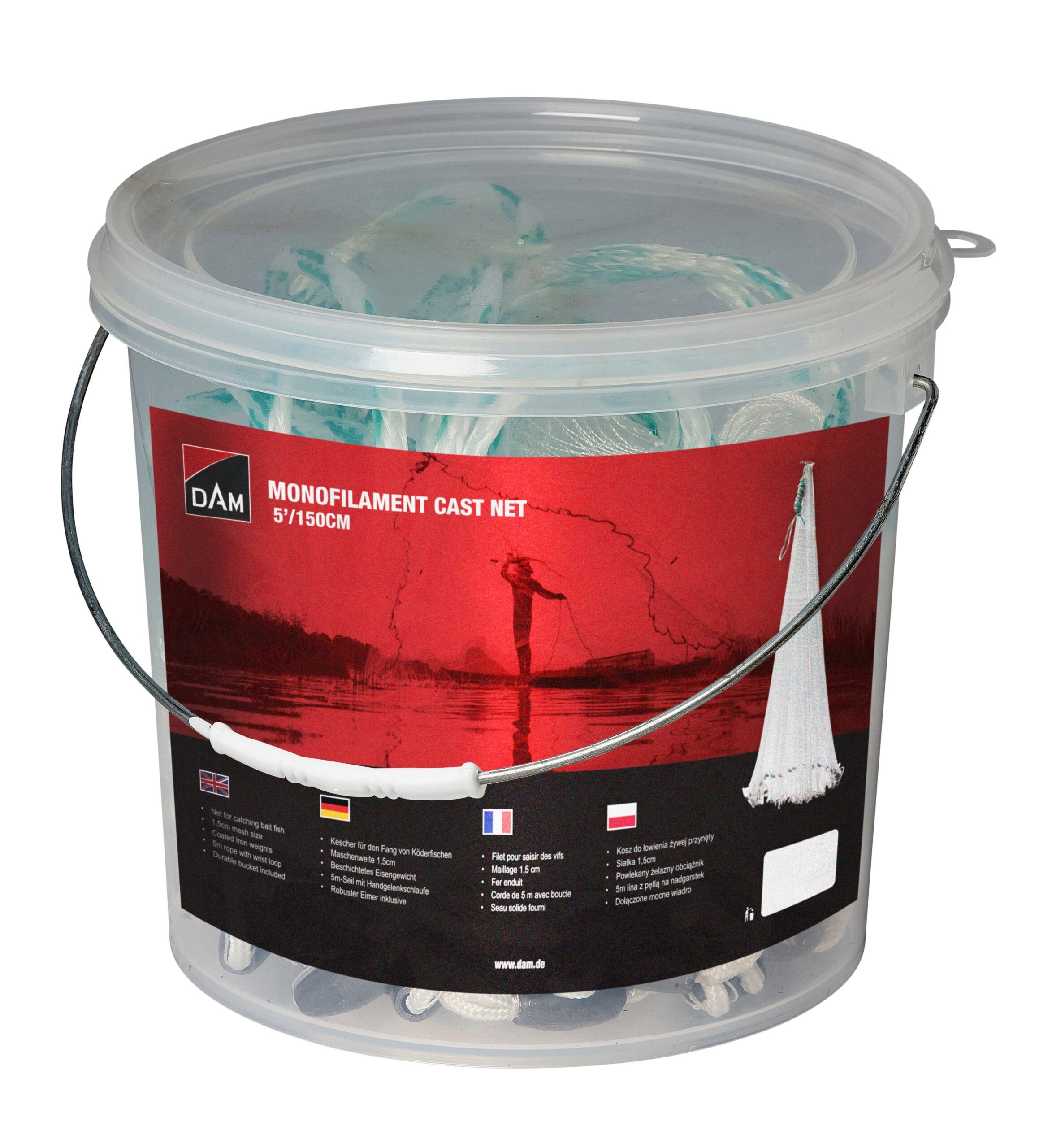 Plasa de aruncat Dam Manitoba Mono, ochiuri 1,5 cm, 150x150 cm, plumb din fier, franghie 5 m, galeata inclusa
